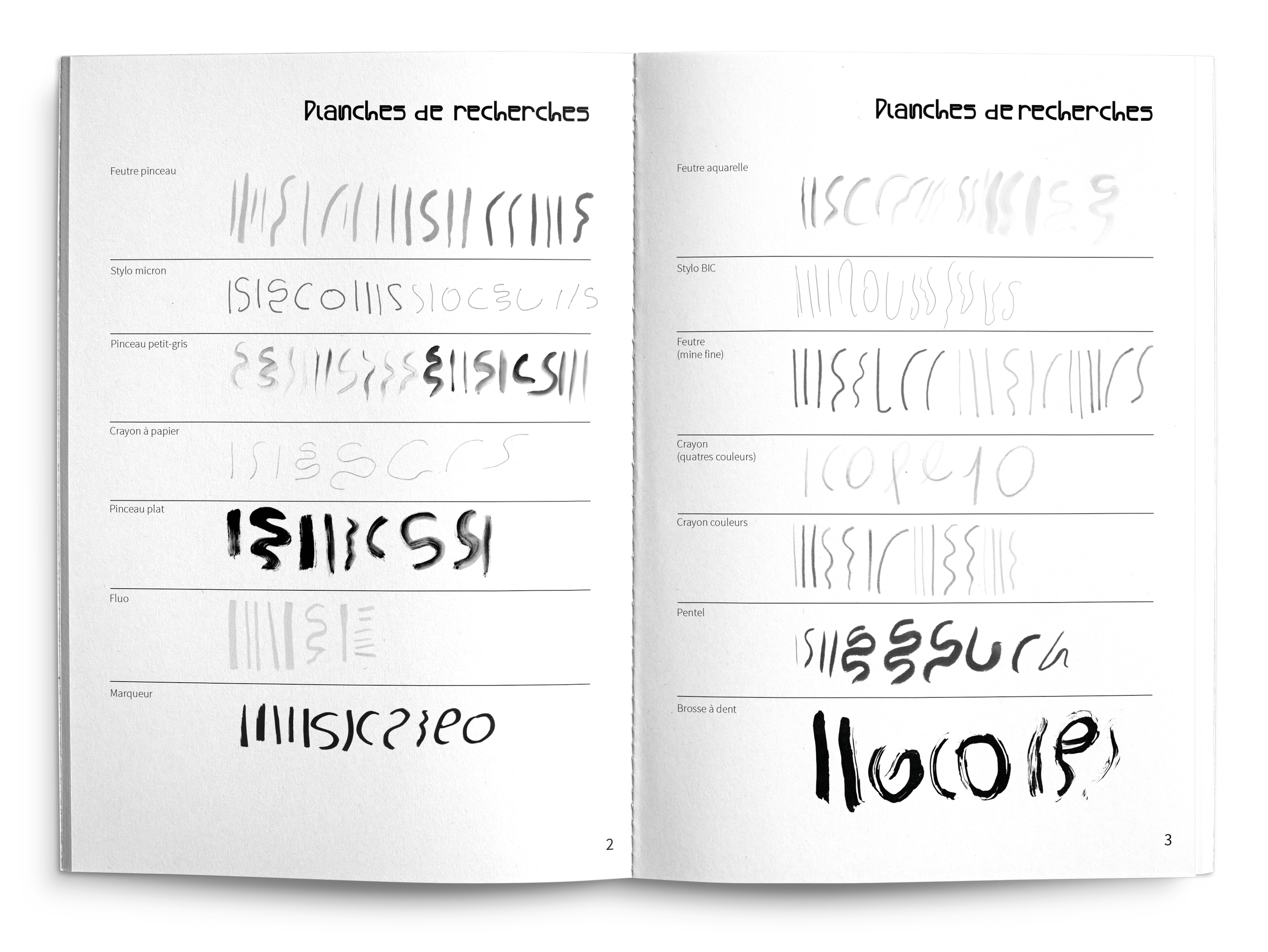 L’objectif de ce carnet était de comprendre l’impact du geste manuel et de l’outil pour le dessin de caractère, d’explorer des pistes, de dessiner, de développer une capacité à représenter une forme de manières variées.