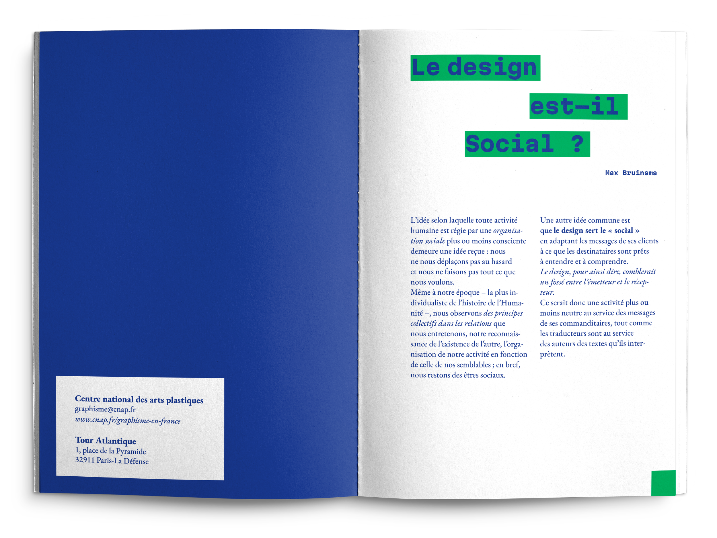 Depuis 1994, le Cnap© mène une politique active au profit du design graphique qui se traduit par la publication de la revue annuelle ‘Graphisme en France’, par la valorisation du design graphique. Cette édition est inspiré de la papeterie et des dossiers institionnels à destination du public. Elle ouvre les portes d’une exploration captivante avec de nouveaux choix graphiques.