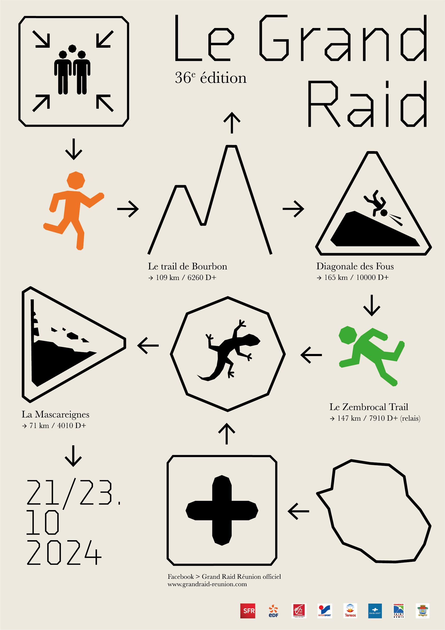 Le Grand Raid© est un ultra-trail organisé sur l’île de La Réunion, composé de la Diagonale des Fous’ la course la plus dure de la discipline, il s’agissait sur cette affiche d’illustrer la technicité et la performance nécessaire pour effectuer cette course. L’aspect graphique est approché de manière conceptuelle et minimaliste sur le thème de la signalétique et permettant de guider (ou de rendre fou) les coureurs.
